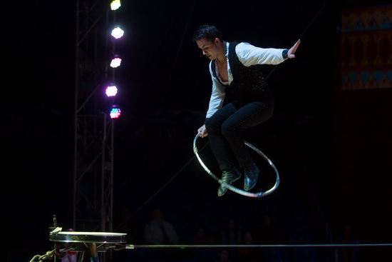Kévin Gruss und seine Partnerin Julia Friedrich begeistern mit ihrer Lovestory am Ringtrapez die Zuschauer. Kraftvolle Haltetricks sehen bei Artisten als Porteur und weite Flüge füllen die große Kuppel des Chapiteau. Gekonnt und sicher erfolgen die ohne Vorteil ausgeführten Aktionen.