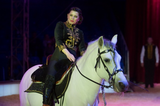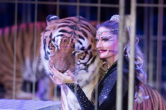 Die dritte Darbietung mit Tieren an diesem Abend ist der sympathischen Carmen Zander mit ihren fünf prächtigen Tigern vorbehalten. Perfekt arbeiten die gepflegten Raubkatzen ihr umfangreiches und attraktives Repertoire. Seit Jahresbeginn wurde einige Tricks variiert. So erfolgt beispielsweise die Futterabnahme von einem Mundstab nun am Platz, zwei hochsitzende Tiger werden nun von einem weiteren übersprungen und zwei Tiere setzen über die drei weiteren, sitzenden hinweg. Pyramide, Teppich, Balkenlauf, ein dynamischer Rückwärtssteiger und die vielfältigen Sprungvarianten gehören natürlich weiterhin zum Gebotenen. Futterabnahme aus der Hand und Schmuseszenen belegen das vertrauensvolle Verhältnis der Tigerlady und ihrer Lieblinge eindrucksvoll. Der Ritt auf einem Tiger mit den beiden flankieren Hochsitzern bietet nach wie vor das eindrucksvolle Schlussbild des Auftritts.