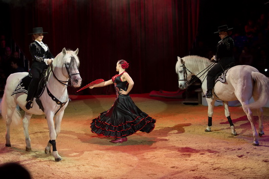 Die Hohe Schule der Familie Saabel, im spanischen Stil präsentiert, lässt die Nummernfolge schwungvoll beginnen. Alexandra Saabel tanzt Flamenco während ihre Mutter und Schwester auf Lusitanos und Friesen ein breites Repertoire reiterlicher Lektionen bieten.