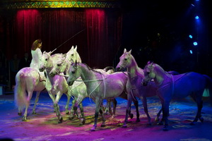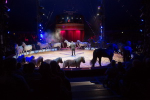 Der Chefdresseur des Hauses, Manuel Frank, präsentiert eine exzellente Auswahl seiner reichhaltigen Dressur-Schöpfungen. Sechs nachtschwarze prächtige Friesenhengste interagieren mit sechs Fallabella-Ponys heller Fellfarbe. Nach einigen Touren nehmen sechs weiße Araber den Platz der Ponys ein. Mit leichter Hand führt der „Maître Ecuyer“ die Chambrière und lässt auch anspruchsvolle Figuren spielerisch leicht wirkend ausführen. Der Zwölfer-Zug sorgt für prächtige Bilder im roten Ring – doch damit nicht genug nimmt Manuel Frank die Ponys noch hinzu und reiht achtzehn Pferde auf dem Hufschlag zu einem geschlossenen Kreis. Etliche Figuren werden erstklassig gearbeitet und mit einem formidablen Steiger der sechs Araber findet die Darbietung ihren gelungenen Abschluss. Chapeau.