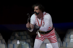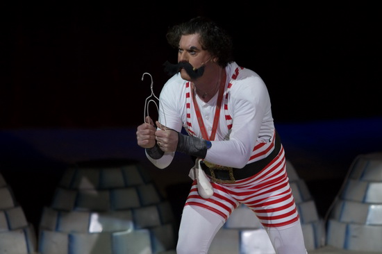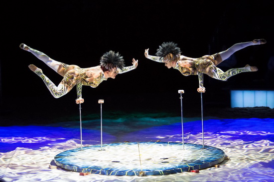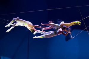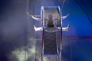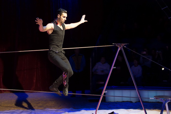 Einen furiosen Auftritt bietet Seilläufer Geoffrey Berhault auf zwei in unterschiedlicher Höhe über Kreuz gespannter Seile. Elegant tanzt, der Ausdruck ist hier wörtlich und höchst berechtigt zu verstehen, der versierte Artist auf den Ebenen und kombiniert die Bewegungen mit einer Reihe akrobatischer Übungen. Sprünge, vorwärts und rückwärts über das höhere Seil erfolgen flüssig und leicht wirkend. Mehrere sehr hohe Spreizsprünge fügen sich genau wie ein exzellent ausgeführter Rückwärtssalto perfekt in die Schrittkombinationen ein. Ein perfekter Vorwärtssalto beschließt die erstklassig dargebotenen Evolutionen.