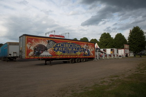 Ein großes Vordach im gleichen Dekor bietet den Besuchern Schutz vor der Witterung. Der Kassencontainer hat seinen Platz seitlich neben dem dekorativen weißen Zierzaun. Ein Sattelauflieger, dessen Schiebeplanen mit dem Namenszug des Unternehmens und zahlreichen Tiermotiven gestaltet ist, komplettiert die Front. Die rechte Platzseite nimmt die Wohnwagen auf und gegenüber sind die zahlreichen Transportfahrzeuge und Zugmaschinen in langen Reihen abgestellt. Die Stallungen sind im hinteren Platzbereich zu finden.