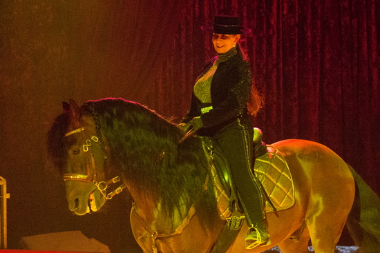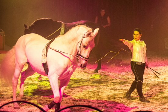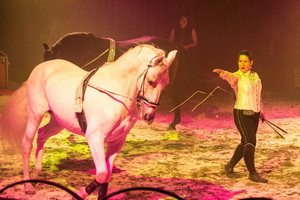 Mit drei Tier-Darbietungen ist Direktorin Monika Freiwald im Programm zu erleben. Zunächst stellt die versierte Tierlehrerin zwei edle Rösser in einer gelungenen Doppel-Freiheit vor. In einem harmonischen Ablauf erfolgen vielseitigen Figuren die allesamt souverän ausgeführt werden. Als „Super Mario“leitet die Chefin des Hauses sechs quirlige Shetland Ponys an ihr erlerntes Können zu präsentieren. Munter ziehen die Min-Pferde ihre Bahnen und zeigen sich als Barrierenspringer. Im zweiten Programmteil reitet Monika Freiwald eine bravouröse Hohe Schule im spanischen Stil. Mit Ausstrahlung und sehr viel Charme werden die verschiedenen Lektionen souverän dargeboten.