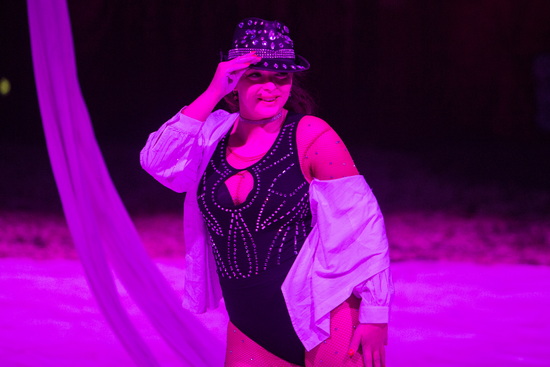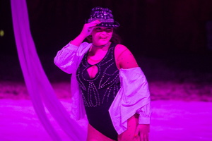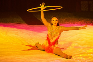 Schwungvoll präsentiert Romina Kaiser ihre Kür mit Hula Hoop Reifen. Temperamentvoll präsentiert die sympathische Artistin ihr variantenreiches Können. Bis zu zwanzig Reifen lässt sie spielerisch wirkend und scheinbar ohne Anstrengung um ihren Körper kreisen. Zudem arbeitet sie hoch unter der Circuskuppel einen gekonnten Act an den Tuchstrapaten. Die vielseitige und umfangreiche Folge typischer Tricks des Genres wird kraftvoll, voller Harmonie und Eleganz ausgeführt.
