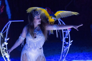 Eine weitere Tier-Darbietung sieht Jennifer Freiwald in Action. Die junge Frau, Enkelin der Direktion, präsentiert in einem abwechslungsreichen Ablauf zwei prächtige Aras. Die beiden großen Vögel überbringen eine Rose, tanzen auf ihren Sitzstangen rotieren an einem Tauende um die Tierlehrerin und spreizen auf Kommando ihre Flügel.