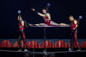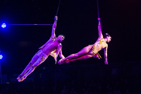 Die beiden Acts des Duo „Avant ta peau“ weisen einen lebhaften Kontrast im Stil des Auftritts auf. In einem leicht rockigen Look, mit moderner Attitüde, sehen wir zunächst das temperamentvolle Spiel mit den Hula Hoop Reifen. In hohem Tempo erfolgen die vielseitigen Tricks und per LED-Technik beleuchtete Requisiten bieten zusätzlichen Schauwert. Eine Reihe der attraktiven Abläufe sehen die Artistin an einer Handschlaufe hoch in der Kuppel schwebend und dabei kreisen zahlreiche Reifen um ihren Körper. Wenig später folgt der eher traditionell gehaltene Auftritt des Duos an Strapaten. Zahlreiche anspruchsvolle Figuren sind in eine poetisch anmutende Liebesgeschichte verpackt, die die beiden Artisten mit ihren weiten Flügen durch den Raum erzählen.