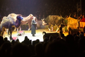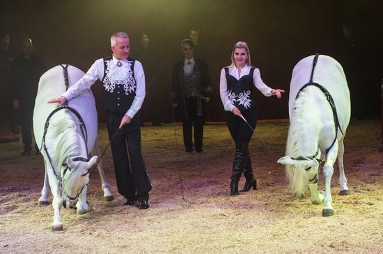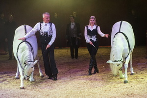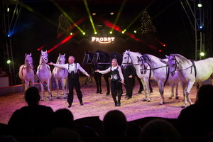 Drei Tier-Darbietungen wurden geboten. Die Kavallerie des Circus Probst, sechs weiße Araber- und drei Friesenhengste, werden in einem abwechslungsreichen Ablauf in immer wieder anderen Zusammenstellungen von Stephanie Probst und Gerd Koch vorgeführt.