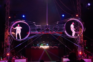 Das Trio Palmer präsentiert zunächst sein Können auf dem Hochseil. Seil springen, Sprung über die Partner, Zwei-Mann-Hoch und Rad fahren sind ie wesentlichen Tricks, ehe der Auftritt in eine Dreier-Pyramide gipfelt. Im zweiten Teil sind die beiden Herren des Trios auf dem Todesrad zu erleben. Blindlauf, Seil springen und riskante hohe Absprünge sind die markanten Tricks der Darbietung.