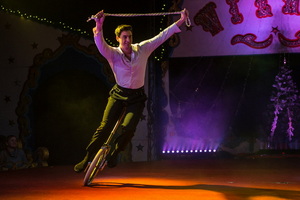 Massimo Rossi präsentiert sein Können auf Einrädern. Er springt Seil und fährt um Kegel Slalom. Ein höheres Rad wird zunächst auf der Kinnspitze balanciert, dann jongliert er auf dem Rad mit Keulen. Die abschließenden Runden dreht der Artist auf einem sehr kleinen Einrad.