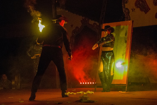 „Wiener Western“ bietet Direktor Ricky Cannone mit Ehefrau Denni Chaves und Tochter Serena. Unter lautem knallen zerlegen Bullpeitschen Zeitungsseiten und rotierende Papierbänder zu kleinen Schnipseln. Dann nehmen die Damen wechselweise ihren Platz vor dem Brett ein und Ricky Cannone platziert die Wurfmesser nahe um ihre Körper. Besonders effektvoll sind die abschließenden Touren mit Messern an deren Griffen sehr starke Flammen brennen.