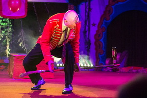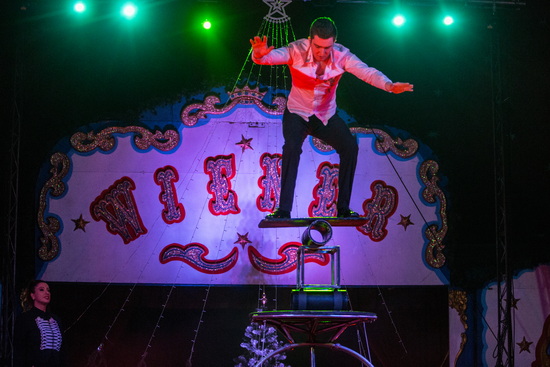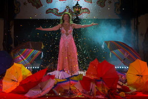Zwei Darbietungen präsentiert Tamara Khurchudova in dieser Show. Zunächst sehen wir ihren neuen, mystisch daherkommenden Magic Act. Gedämpftes Licht und Nebel bilden den geeigneten Rahmen für die Manipulationen. Scheinbar aus dem Nichts erscheinen zahlreiche Schirme unterschiedlichster Größe und „bevölkern“ die Bühne. Immer wieder wandeln sich schlichte weiße und rote Tücher, die die Magierin manipuliert in weitere Schirme. Mehr als vierzig seien es, lässt sie uns wissen, als schließlich zwei große Sonnenschirme den Höhepunkt des Auftritts bilden und die Artisten im Konfettiregen einen Kostümwechsel vollzieht.