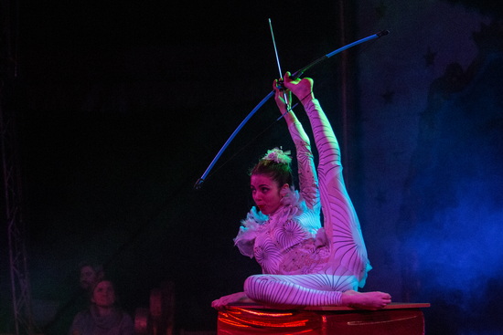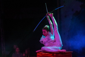 Miss Ixchel aus Mexiko arbeitet zunächst gekonnte Kontrosionen. Ein ums andere Mal biegt sie Körper und Gliedmaßen in extreme Positionen und mit einem gekonnten Pfeilschuss, mit den Füßen und im Handstand stehend, findet der Auftritt seinen gelungenen Abschluss. Ihr Act an den Strapatentüchern ist im zweiten Programmteil platziert und bringt eine Reihe relevanter Tricks des Genres. Elegant und gekonnt erfolgen die Aktionen in der Zeltkuppel.