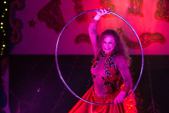Im Flamenco-Stil präsentiert Tamara Khurchudova ihr Spiel mit den Hula Hoops. Perfekt sind Bewegung und Jonglage auf den Rhythmus der Musik abgestimmt. Licht, Musik und Jonglage sind hier eine hervorragende Einheit.