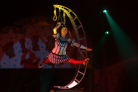 In einem sich permanent drehenden Mond arbeitet Miss Carla ihre Akrobatik. Kraftvoll und elegant erfolgen die vielseitigen Tricks. Abschließend nimmt die Artistin ihren Platz in einer großen Kugel ein und versetzt diese nur durch Verlagerung ihres Gewichtes in schnelle Rotation.
