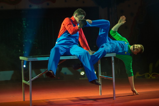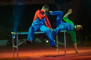 „Abladen!“ - „Aufladen!“ weist der August seinen Partner – Leonardo de Vos – im großen Entrée an. Immer wieder muss der August das „schwere“ Artistengepäck auf und von der Schulter wuchten und schließlich bricht er zusammen. Nun endlich dürfen sie gemeinsam mit dem Direktor musizieren, doch neue Komplikationen tun sich auf und schließlich stört ein „Ungeheuer“ das fröhliche Spiel der Clowns.