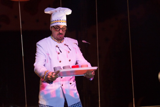 Giody Ukmar erfreut als Koch sein Publikum mit einer Tellerjonglage. Routiniert lässt er die Teller auf ihren Stäben kreisen und, nachdem alle neun Teller rotieren finden auch die vier Löffel den Weg vom Tablett in die Gläser.