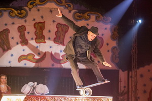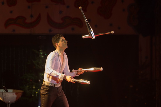 Tempojongleur Joshua Ukmar absolviert die ersten Touren mit Devil Sticks. Versiert lässt er einen Tennisschläger auf den Stäben tanzen. Die folgenden, vielseitigen Routinen werden mit Keulen ausgeführt, dann hält der junge Mann bis zu sieben Ringe sicher in der Luft. Abschließend schwirren Teller, Ufos gleich, durch das Zelt.