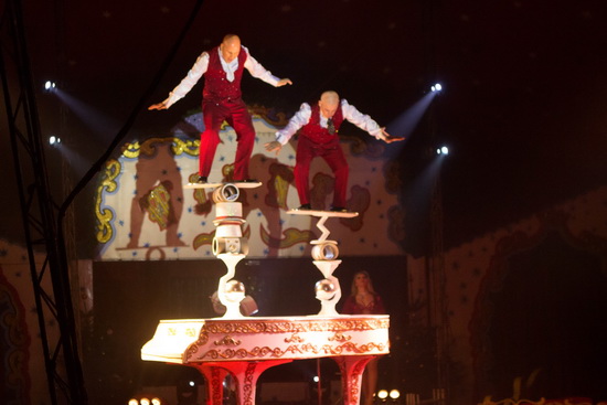 Als Höhepunkt der akrobatischen Darbietungen erleben wir die Rola-Darbietung des Duo Gaspard. Ein Flügel wird auf der Bühne in Stellung gebracht und im weinroten, mit glitzernden Steinchen besetzten Frack nimmt Ivo Monteiro daran Platz. Dann erklimmt er das Instrument und beginnt seine Evolutionen auf der Rola. Alle Requisitenteile sind optisch dem Thema 'Klavierkonzert' angepasst - Zwischenwalzen stellen stilisierte Zylinderhüte dar, Aufstiegshilfen wurden a la Klavierhocker gestaltet - und stilsicher in schwarz und weiß gehalten. Vater Gaspard nimmt bereits nach der Pause, einen angesäuselten Herrn in den besten Jahren mimend in einer Loge Platz. Dann erstürmt er in bekannter Manier als 'betrunkener Gast' die Bühne und ist mit einem Satz auf dem Flügel. Vom Direktor der Bühne verwiesen „stürzt“ er in einer Art, die Stühle mitreißend zurück in die Loge, dass keine Zweifel an der Echtheit des Sturzes aufkommen.