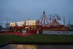 Im Reinaldapark von Haarlem waren die im Frühjahr neu erworbenen, prächtigen Zeltanlagen aufgebaut. Das Vier-Masten-Chapiteau, weiß mit roten Applikationen, von ca. Zweiunddreißig Meter Durchmessern in moderner Formgebung, die bis zu den Mastspitzen hochgezogene Plane überragt die langgestreckte Kuppel, ist die Spielstätte des Circus. Mittels eines Tunnels ist es mit dem Vorzelt, einem quadratischen, rot-weiß gestreiften, sehr hohen Ein-Masten-Zelt verbunden.
