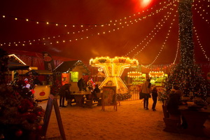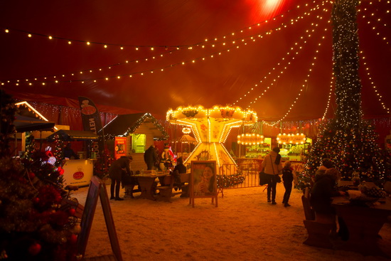 Im Vorzelt herrscht eine angenehme, gemütliche Atmosphäre. Der Holzboden ist mit Sägespänen bedeckt und zahlreiche Lichterketten spannen sich aus der Kuppel zum Rondell. Zahlreiche, reich geschmückte Weihnachtsbäumen sorgen für das nötige Flair. Die prächtig gestalteten Container der Circusrestauration nehmen eine Seite ein. Gegenüber ist ein nostalgisches Kinderkarussell platziert. Kunstvoll gefertigte und mir Circusmotiven liebevoll dekorierte Verkaufsstände funkeln im Glanz ihrer Lichter.
