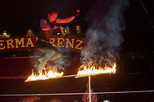 Francesco Nock aus der Schweiz tanzt auf dem Seil. Viele dynamisch ausgeführte Sprünge – durch einen in der Hand gehaltenen Reifen, über brennendes Barrieren, Seil springen - dominieren den Auftritt. Eine Handstandwaage wird souverän balanciert und abschließend führt ein Sprung durch einen großen, mit Messern gespickten und lodernden Fackeln versehenen Ring.