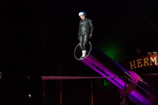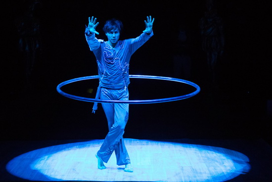 Höchst selten sind Männer mit Hula Hoop in der Manege zu sehen. Anton Monastyrsky hat dieses Genre gewählt und interpretiert das Spiel mit den Ringen, elegant und sehr viel athletischer als seine weiblichen Kollegen.