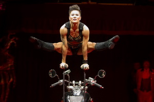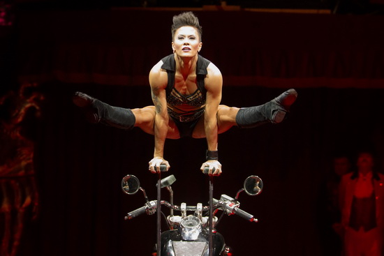 Melanie Chy präsentiert ihre starke Handstand-Equilibristik auf einem schweren Motorrad. Exzellent werden die verschiedenen Handstandfiguren ausgeführt. Scheinbar ohne Anstrengung, spielerisch leicht wirkend erfolgen Handstandwaagen und Einarmer.