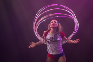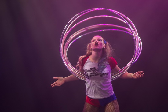 Katja Sazonova lässt die Besucher bei ihrer temperamentvoll vorgetragen Hula Hoop Darbietung jubeln. In vielerlei Formationen und Variationen kreisen die Ringe um Körper und Extremitäten der Artistin.