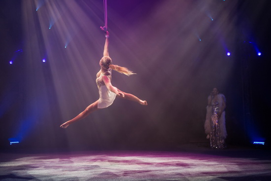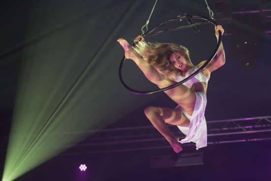 Alexandra Sazonova ist mit ihrer bekannten Darbietung am Luftring in der Show vertreten. Kraftvoll und elegant arbeitet die sympathische junge Frau ihre starken Tricks. Ein Abfaller von der oberen Stange in den Ring beendet den Auftritt in idealer Weise.