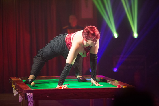 Sheyen Caroli bietet ihren Kontorsion Act, der auch eine Reihe Handstandelemente enthält, auf einem Billardtisch dar. Als Mann verkleidet, markiert sie ein wenig Billard spielen um sich als bald zu entkleiden und in sexy roten Dessous, zum Song „It's a mans world“, auf dem Billardtisch zu räkeln. Im Rahmen eines Familienprogramms, das nur Nachmittagsvorstellungen kennt, ein etwas gewagter Auftritt.