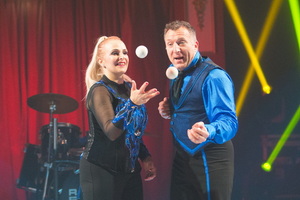 Zwei Mal erleben wir das Duo Platchkov in dieser Show. Zunächst präsentiert Stefan Platchkov sein Können auf der Freistehenden Leiter. Gekonnt und in hohem Tempo führt der versierte Artist seine variantenreichen Balancen aus. Schließlich steht er auf der Spitze einer Leiter und jongliert mit Keulen.