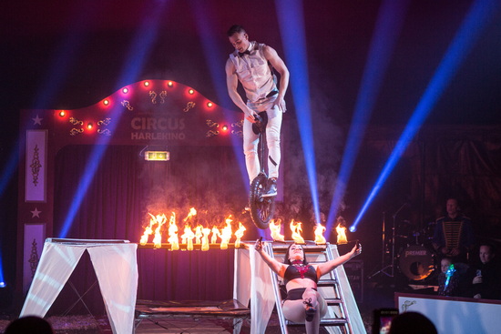 Noch einmal erleben wir Lénárd & Daniella, nun mit einer ungewöhnlichen Einrad-Darbietung. Zwei höhere Podeste sind mit einem mittig angeordneten kleinen Trampolin verbunden und Treppe an einem der Podeste komplettiert den Aufbau. Dieser Parcours erlaubt variantenreiche Sprünge zwischen den einzelnen Elementen und rasante Fahrten die Treppe hinab. Sprünge über die Partnerin und Touren im Zwei-Mann-Hoch auf dem Einrad komplettieren die Trickfolge, die überqueren einer Planke, die mit lodernden Fackeln gespickt ist, gipfelt.