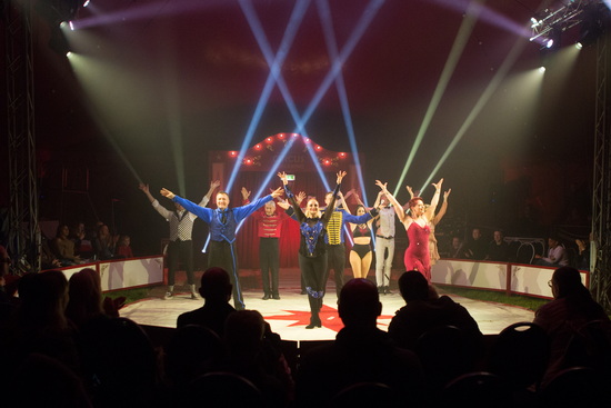 Im Zeltinnern herrscht eine heimelige Atmosphäre. Lichterketten, von der Kuppel zum Rondell gespannt, spenden warmes gelbes Licht. Feine rot-weiße Logen mit beguemen Polsterstühlen und das vierreihige Schalensitzgradin, das mit dunkelrotem edlen Samt mit goldenen Bordüren zum Gang davor abgeschlossen ist, bilden die Sitzeinrichtung. Rot-goldene Blenden bilden den Rahmen um den roten Samt des eleganten Artisteneingang. Mit einem vorzüglichen Lichtdesign der eindrucksvoll bestückten Beleuchtungsanlage wird die Show in erstklassiger Weise in Szene gesetzt. Die leistungsstarke Tonanlage zeigt sich gleichfalls auf Höhe der Zeit und sehr gut gewählte Begleitmusiken unterstützen die Darbietungen.