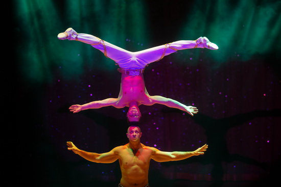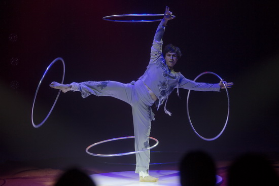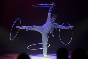 Anton Monastyrski ist einer der wenigen männlichen Artisten, die mit einer Hula Hoop Darbietung auftreten. Die ersten Touren erfolgen mit einem überdimensionalen, sehr massiv wirkenden Reifen. Die weiteren, schnell und sehr kraftvoll ausgeführten Abläufe werden durchweg in Verbindung mit akrobatischen Tricks vorgetragen.