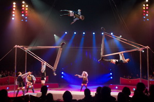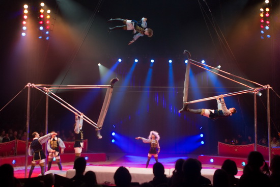 Die sechs ArtistenInnen der russischen Truppe Pronin agieren in einem sehr dramatisch inszenierten Auftritt an der doppelten Russischen Schaukel. In Kostümen die historischen Uniformen nachempfunden sind und zu schwerer pathetischer Musik werden die vielseitigen hohen Wechsel von einer zur anderen Schaukel perfekt absolviert.