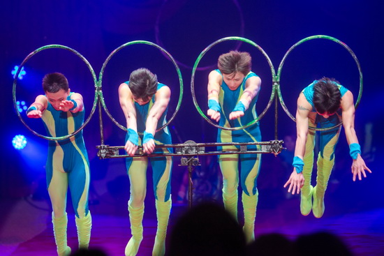 Die Finalnummer gestalten die fünfzehn Reifenspringer der Beijing Acrobatic Troupe. Auf selbstdrehenden Gestellen montiert, verändern die Reifen ihre Formationen und können zudem rotieren. Für die Artisten ergeben sich somit unzählige Variationsmöglichkeiten bei ihren stets perfekt funktionierenden Saltos und Pirouetten durch die Ringe. Schließlich wird der zu durchquerende Reifen in immer größerer Höhe platziert und im letzten Durchgang führt der Sprung auf mehr als drei Meter über der Manege. Der ohne unterstützende Technik durchgeführte Trick gelingt im dritten Versuch.