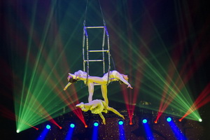 „Air Trio“ nennt sich die Formation dreier junger Frauen, die ihr Luftballett an einem sechseckigen Apparat arbeiten. Durch ein mit Worten nicht zu beschreibendes Lichtdesign in unvergleichlicher Weise in Szene gesetzt, verzaubern die Artistinnen mit ihrer poetischen Darbietung und reißen das Publikum zu Beifallsstürmen hin.