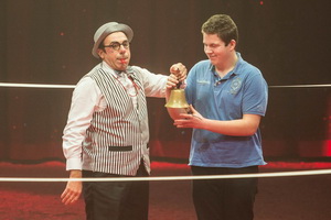 Vladimir Omelchenko begeistert mit einem tempogeladenen Auftritt auf der Rola-Rola. Schwungvoll werden die verschiedenen Balancen auf dem labilen Untergrund vorgetragen. Er springt auf der Rola Seil, jongliert und türmt fünf Bänkchen unter seinen Füssen aufeinander. Schlußendlich bilden acht Rollen und Zwischenlagen einen mannshohen Turm, auf dem der Artist sicher die Balance hält.
