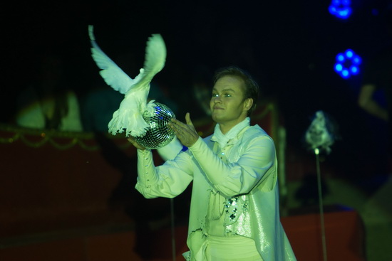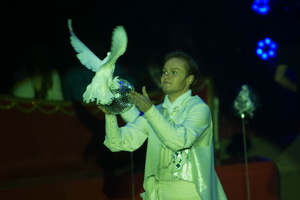 Die gleich nach dem Käfigabbau folgende zweite Tiernummer des Programmteils steht in starkem Kontrast zu soeben Gesehenen. Andrejs Fjodorov und seine Pfauentauben agieren in einem verspielt romantischen Ablauf, in den auch ein Hahn und ein großer weißer Spitz eingebunden sind, miteinander.
