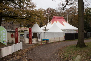 Im Schlosspark, direkt am einem Kanal, findet auch der Circus seinen Platz. Das schmucke weiß-rote Chapiteau mit den feinen goldfarbenen Applikationen steht unter hohen Bäumen und bietet in der heraufziehenden frühen Dämmerung einen romantischen Anblick. Dieser wird durch den nostagisch wirkenden Kassenwagen und den dekorativen Frontzaun mit seinem hoch aufragenden Portal verstärkt. Der Verkaufswagen der Circusrestauration hat einen zentralen Platz im Vorzelt und der gesamte Bereich der Zeltanlagen ist mit einem Holzboden ausgelegt.