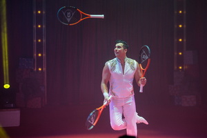 Tennisjongleur Glenn Folco startet seinen Auftritt mit einem Racket, das er variantenreich auf Devil Sticks tanzen lässt. Bald darauf manipuliert er zunächst drei Tennisschläger und nimmt dann noch einen Ball dazu. Schließlich sind es fünf Rackets, die sicher gehandhabt werden.