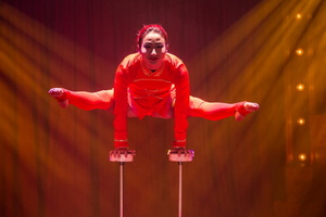 Die chinesische Artistin Dou Dou, sie war auch im Tourneeprogramm des Unternehmens zu erleben, präsentiert anmutig ihre trickstarke Handstandequilibristik. Elegant ausgeführt und mit fließenden Abläufen reihen sie die verschiedenen Figuren aneinander und auch der abschließende Schuss mit Pfeil und Bogen gelingt exzellent.