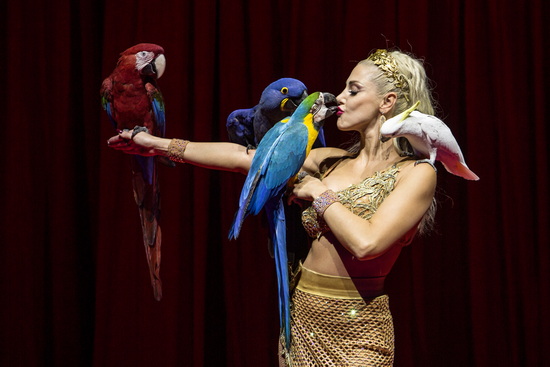 Gleichfalls zwei Darbietungen sehen Elisa Cussadié in Aktion. Zunächst sind drei Aras, ein Kakadu und ein Schwarm Sonnensittiche ihre Manegenpartner. Der Kakadu fliegt durch drei Ringe, die Kinder emporhalten und die Sonnensittiche landen auf den Köpfen, Armen und Händen der Kinder. Die Aras überbringen einer Besucherin eine Rose und tanzen auf ihren Sitzplätzen. Weite Flüge über das Gradin sind Höhepunkt und Abschluss des Auftritts.