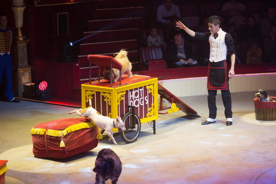 Die turbulente Hunderevue von Pat Clarrison lässt die Stimmung auf den Rängen gleich zu Programmbeginn steigen. „Hot Dogs“ ist das Motto der Nummer und passend zum Thema sind die Requisiten gestaltet. Die vier Hunde und ihr Vorführer agieren mit viel Schwung und kommen beim jungen Publikum gut an.