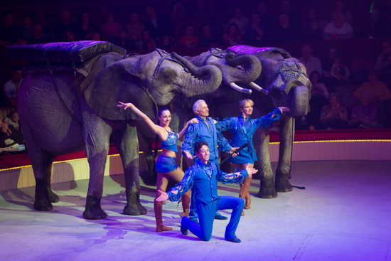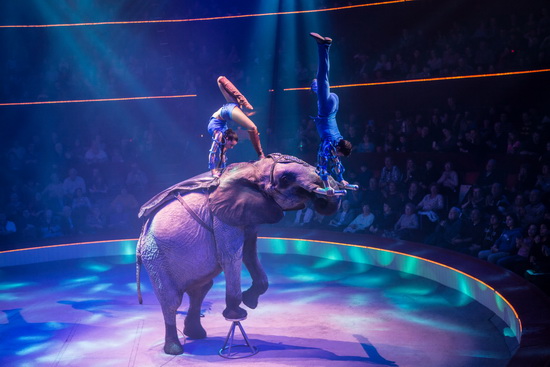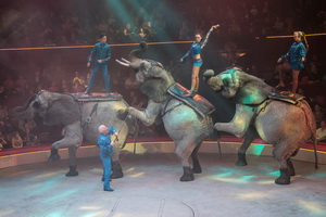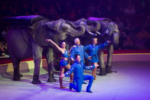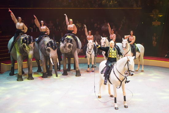 Drei Elefanten – Bulle Mambo pausierte in der von uns besuchten Vorstellung – und drei weiße Araber bringt René Casselly in einer temperamentvollen Abfolge in die Manege. Sämtliche Vierbeiner werden von Mitgliedern der Familien Casselly und Bouglione beritten. Abwechslungsreiche Lauffiguren und Interaktionen der Elefanten und Pferde laufen gekonnt unter der meisterhaften Führung des Dompteurs ab.