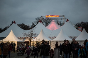 Etliche Weihnachtsbäume und Weihnachtsmarkthütten, großer Weihnachtsschmuck an zwei Traversen in der Zeltkuppel und viel roter Stoff sowie roter Teppich verleihen dem Vorzelt Struktur und Atmosphäre.