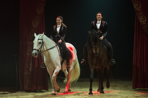 Direktionstochter Milena Kretz und Christina Togni reiten eine formidable doppelte Hohe Schule. Gemeinsam und auch in Soli präsentieren sich die beiden charmanten Amazonen und bieten dabei ein breites Spektrum verschiedener reiterlicher Elemente.