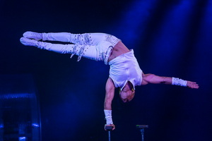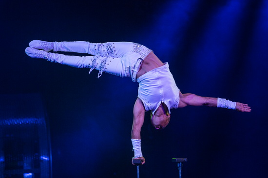 Effektvoll startet Armando Liazeed seine Handstand-Equilibristik mit einem Kopfstand auf einer rotierenden Spiegelkugel. Etliche anspruchsvolle Handstandfiguren mit stetig steigendem Schwierigkeitsgrad folgen in exzellenter Ausführung. Im Kopfstand werden eine Reihe Sprünge auf einer schmalen Planke ausgeführt und mit einem spektakulären Kötzchensturz ist der Höhepunkt des Auftritts erreicht.