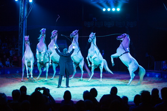 Direktor Elmar Kretz präsentiert seine, kürzlich beim „Circusfestival of Italy“ in Latina bei Rom, mit mehreren Preisen ausgezeichnete Pferdefreiheit. Die sechs weißen Araberhengste beherrschen ein umfangreiches Repertoire unterschiedlicher Lauffiguren, das souverän gemeistert wird. Mit sparsamen Gesten und in erster Linie stimmlichen Anweisungen dirigiert der versierte Tierlehrer die hervorragend ablaufenden Act. Ein fulminanter Gruppensteiger aller sechs Pferde und verschiedene, temperamentvoll ausgeführte Da Capo Steiger runden die Darbietung in idealer Weise ab.
