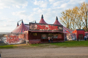 Die schwarz und rot gestreiften modernen Zeltanlagen leuchten in der Abendsonne und durch massive, aus rohem Holz gefertigte Türen führt der Weg in einen unheimlich wirkenden Gang ins Innere der Anstalt. Weißer Stoff, Untersuchungsliege, Rollstühle und weiteres medizinisches Zubehör stimmt auf das Thema ein und in der Cafeteria der Irrenanstalt – dem Vorzelt – sieht man sich zunächst der „Medikamentenausgabe“, einer großen Bar, gegenüber. Die „Essensausgabe“ hält Grillspezialitäten bereit und weitere „Ausgaben“ sowie ein Souvenir-Shop sind entlang der Zeltseiten platziert. Mit der reichen und liebevoll arrangierten Dekoration wird der Charakter einer Anstaltskantine verstärkt.